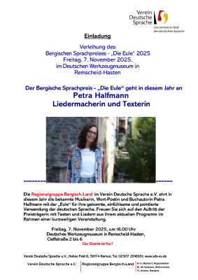 • 07.11.25: Verleihung des Sprachpreises „Die Eule“, Werkzeugmuseum Remscheid, 16.00 Uhr